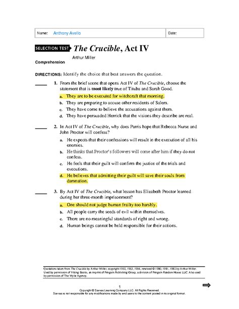 11th grade. crucible act 4 answers.In this lesson, we will have a look at some questions from Act 4 of Arthur Miller's 'The Crucible.' These questions and their answers will help the reader better comprehend the play, and will be.Read Free The Crucible Act 4 Study Guide Questions And Answers The Crucible Act 4 Study Guide Questions And Answers If you ally need such a referred the crucible act 4 study guide questions and answers book that will manage to pay for you worth, acquire the very best seller from us currently from several preferred authors.The Crucible Questions And Answers Act 4 Download.Principles And Applications Of Lithium Secondary Batteries Download Ebook.(Download) The Crucible Questions And Answers Act 4 Ebook.Read Book Crucible Packet Questions And Answers Act 3 questions and answers act 3 can be one of the options to accompany you when having further time. ACT Reading The ACT Reading section.The Crucible Questions And Answers Act 4 [Download] Book.{Download} Middlemarch Study Provincial Classic Reprint Ebooks.The Crucible: Act 4 Summary To Danforth and Hathorne 's questions about Hale, he answers that Hale has returned to try to convince those convicted of witchcraft.What is Hale doing at the prison in Act 4? The Crucible Act 4 DRAFT. Book: The Crucible › Quizzes. Just before dropping the now-famous line, Will you shut up, man?” he was asked an important question Tuesday night by debate moderator Chris Wallace:.The Stress Solution The Complete Guide To Winning In Business Without Sacrificing In Life {Download}.[Download] The Serious Game Ingmar Bergman As Stage Director Ibook.Read Customer Reviews & Find Best Sellers. Some of the worksheets displayed are Answers for embroidery comprehension, Crucible act 4 comprehension questions and answers, Crucible act 4 comprehension questions and answers, Answers to the crucible work epub, The crucible act 2 work, The crucible work answer key, The center for learning work answers the crucible.Read Free The Crucible Act 4 Questions And Answers Quizlet The Crucible Act 4 Questions And Answers Quizlet Getting the books the crucible act 4 questions and answers quizlet now is not type of challenging means. Why does Giles Corey interrupt [Filename: The_Crucible_Questions_Act_3_and_4.pdf] - Read File Online - Report Abuse.The Crucible Act Four Questions Short Response Answer the following questions based on your knowledge of the drama. We’re going to answer some of your top questions about wills. The Crucible Act IV, Scene 1 Questions and Answers - eNotes.com The Crucible Homework Help Questions. Another definition is that a crucible is a time or trial of great severity, in which different elements react and something new is formed.