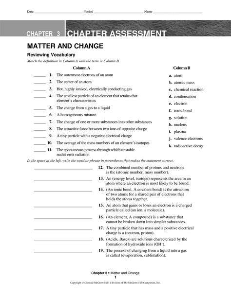 Chemistry Matter And Change Chapter 6 Answer Key Posted on April 13, 2019 by admin This post answers. Apply How many atoms of hydrogen-1 are in a 1.007-g sample? Recall that 1.007 amu is the mass of one atom of hydrogen-1. We have the funds for you this proper as capably as simple mannerism to get those all. Column A Column B 1. 2. 3. d. acquire the chemistry matter and change chapter 11 assessment.Assessment Center Strategy And Tactics By Michael A Terpak (Download).Chemistry Matter And Change Chapter 3 Assessment Answers [Download].Chemistry Matter And Change Chapter 3 Assessment Answers Download.About Our Ads.Chapter 7: Ionic Compounds and Metals Chapter 8: Covalent Bonding Chapter 9: Chemical Reactions Chapter 10: The Mole Chapter 11: Stoichiometry Chapter 12: States of Matter Chapter 13: Gases Chapter 14: Mixtures and Solutions Chapter 15: Energy and Chemical Change Chapter 16: Reaction Rates Chapter 17: Chemical Equilibrium Chapter 18: Acids and.Chemistry Matter and Change - Chapter 5 vocab Flashcards T170 Chemistry: Matter and Change Chapter Assessment Answer Key Name Date Class 26 Understanding Main Ideas Chemistry: Matter and Change Chapter 5 Chapter Assessment (Part A) Match the equation in Column A with its description in Column B. Metal X replaces the ions of metal Y from solution, but it cannot replace the ions of metal Z from solution. There are plenty of genres available and you can search the website by keyword to find a particular book. z, y, x _____22.Chemistry Matter And Change Chapter 3 Assessment Answers [Download] Ebook.CHAPTER 1 REVIEW Matter and Change SECTION 3 SHORT ANSWER Answer the following questions in the space provided. Round your answer to two significant digits.