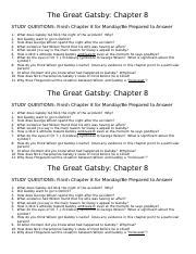 English. By half past two George asked the to Gatsby’s house. Scott Fitzgerald's The Great Gatsby. As Gatsby's hopes die, Nick's loyalty to him seems to grow, and it is interesting that Nick has, after everything, finally realized that he is truly very fond of Gatsby, and worries about him in the aftermath of the night before.8. Perfect for acing essays, tests, and quizzes, as well as for writing lesson plans.26.10.2018 · Chapter 8 Questions and Answers. kelseymarie4. by teachmullins.